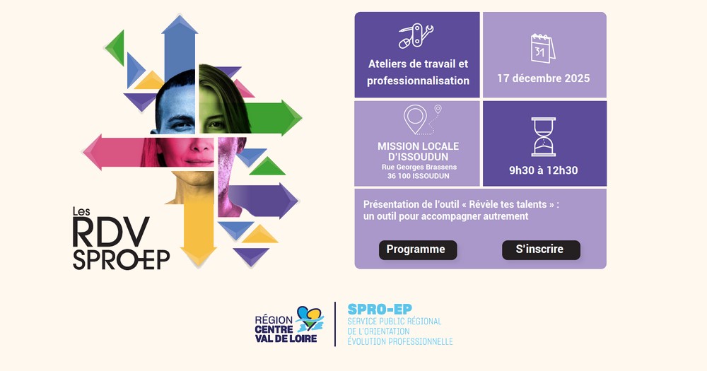17 déc. 2025 Présentation de l'outil "révèle tes talents" pour accompagner autrement Matinée de professionnalisation du SPRO-EP d'Issoudun. Lieu : ISSOUDUN - Mission locale - rue Georges Brassens Thématique : Accompagnement du public Public : Professionnel orientation